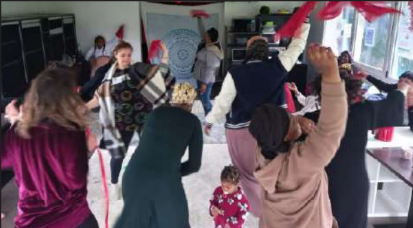L’intervenante, Erika, invite les femmes à « danser » autour de différentes thématiques, en s’appuyant sur une approche inspirée du théâtre gestuel. À travers le souffle, le mouvement, la voix et le ressenti, elle les guide dans un processus d’exploration corporelle et d’expression personnelle.